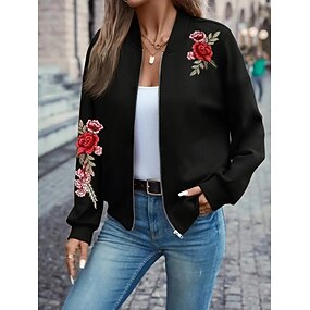 Damen Freizeitjacke Bequem Atmungsaktiv Reißverschluss Druck Lässig Blumen Urlaub Straße Alltagskleidung Ausgehen Reisverschluss Regulär Stehkragen Normale Passform Langarm Oberbekleidung Schwarz