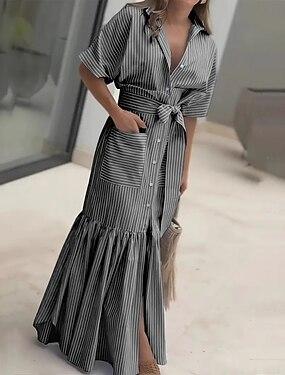 Damen Maxikleid Freizeitkleid A Linie Kleid Elegant Strand Normale Passform Grafik Gestreift Kurzarm Hemdkragen Blau Schwarz Rosa Rote Sommer Frühling