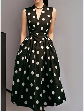 Damen Midikleid Freizeitkleid Arbeitskleidung Gepunktetes Kleid Elegant Mode Modern Outdoor Urlaub Ausgehen Normale Passform Punkt Ärmellos V Ausschnitt Schwarz Weiß Sommer Frühling