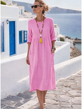 Damen Midikleid A Linie Kleid Sommerkleid Lässig Täglich Lässiger Schnitt Einfach Dreiviertelarm Rundhalsausschnitt Blau Gelb Rosa Fuchsie Sommer Frühling