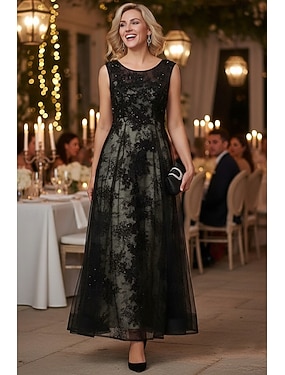 A-Linie Knöchellänge Partykleid Cocktailkleid Kleid für Hochzeitsgäste Brautmutterkleid Ärmellos Rundhalsausschnitt Elegant Vintage Schwarzes Kleid Formell Spitze Tüll mit Spitze
