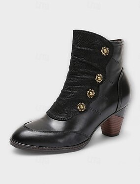 Damen-Stiefeletten aus rotem Vintage-Leder – hochwertiges Rindsleder mit floralen Knopfakzenten und klobigem Absatz für Retro-Stil und Alltagskleidung