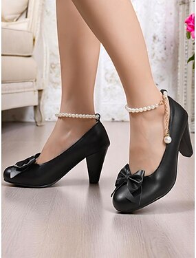 schwarz-weiße Pumps mit Blockabsatz und Schleifendetail für Damen – Vintage-inspirierte Schuhe mit niedrigem Absatz fürs Büro, die Freizeit und elegante Anlässe