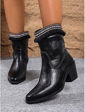 Damenstiefeletten aus braunem Kunstleder im Westernstil – Cowgirlstiefel mit Blockabsatz und Fransenbesatz und Stulpe im Ethno-Muster, stylisches Schuhwerk für den Herbst