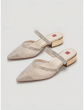 Damen-Mules mit spitzer Zehenpartie und Strassbesatz – champagnerfarbene Sandalen mit niedrigem Blockabsatz für Cocktailpartys &Sommerhochzeit
