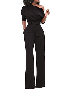 Damen Normal Jumpsuit Elegant Feste Farbe Halbe Ärmel Ein-Schulter Tasche Hohe Taillenlinie Hochzeit Party Regular Fit Schwarz Weiß Gelb Herbst
