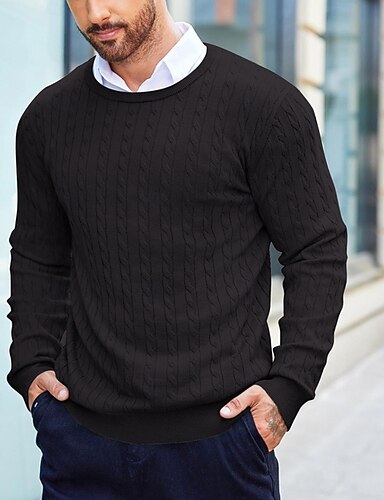irischer Pullover für Herren, Strickpullover, gerippt, Zopfmuster, normale Oberteile, gestrickt, einfarbig, Rundhalsausschnitt, modisch, Basic, Urlaub, Alltagskleidung, Kleidung, Herbst & Winter, schwarz