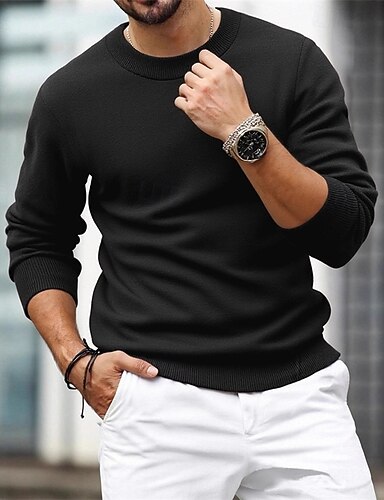 Herren Pullover Gerippt Stricken Normale Oberteile Gestrickt Schmale Passform Einfach Rundhalsausschnitt Strickware Zeitgenössisch Lässig Alltagskleidung Bekleidung Herbst Schwarz Weiß S M L