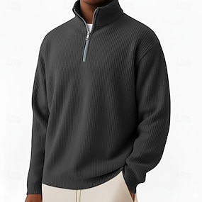 Herren Waffel-Poloshirts Textur Lässig Outdoor Reißverschluss Viertelreißverschluss Langarm Mode Modern Einfarbig Texture Gestrickt Frühling & Herbst Ganzjahres Bequeme Passform Schwarz Dunkelgrün