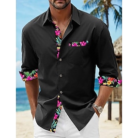 Herren Hemd Leinenhemd Sommerhemd Strandbekleidung Knopfhemd Blumen Urlaub Kreuzfahrt Schwarz Weiß Rosa Blau Langarm Revers Frühling & Herbst Bekleidung Spleißen