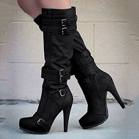 Schwarze kniehohe Plateaustiefel mit Blockabsatz für Damen – Kostümschuhe aus Kunstleder im Retro-Gothic-Stil der 80er für Halloween, Rockmusikfestivals und Party-Outfits