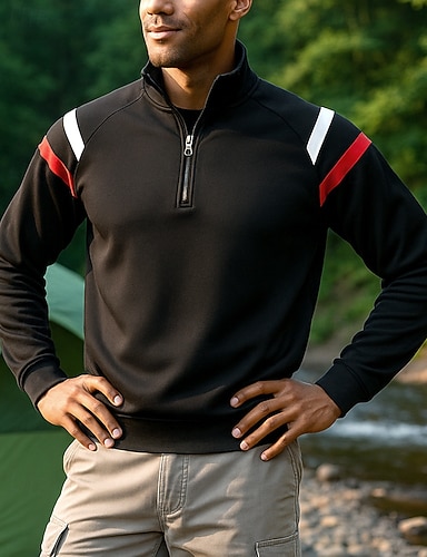 Herren Polo-Sweatshirt Wanderspitze Langarm Stehkragen Oberteil Außen Schnelltrocknend Leicht Elastisch Atmungsaktiv Frühling Herbst Viertelreißverschluss Pullover Polyester Tarnung Schwarz Armeegrün