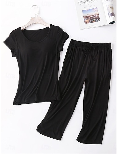 Damen-Pyjama-Sets in reinen Farben, schlicht, bequem, für zu Hause, für den Alltag, modal, atmungsaktiv, Rundhalsausschnitt, kurzärmelig, T-Shirt, Hose, Brustpolster, Sommer-Home-Outfits