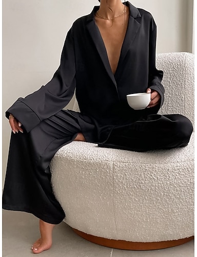 Damen Schlafanzug Set Mode Lässig Komfort Einfarbig Satin-Seidenpyjamas Knopf hoch Elastischer Bund Hemd Hose Täglich Heim Langarm Hemdkragen Schwarz Grün Sommer Frühling Herbst Normale Passform