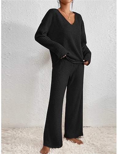 Loungewear-Sets für Damen in reinen Farben, lässig, bequem, weich, für zu Hause, für den Alltag, Urlaub, Strick, atmungsaktiv, V-Bügel, langärmelig, Pullover, Hose, Herbst-Winter-Home-Outfits