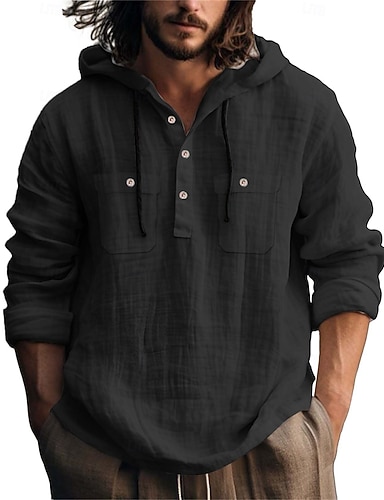 Herren Hemd Leinenhemd Strandbekleidung Knopfhemd Kapuzenhemd Einfach Urlaub Lässig Schwarz Weiß Blau Grün Langarm Mit Kapuze Herbst Frühling & Sommer Bekleidung Knöpfe
