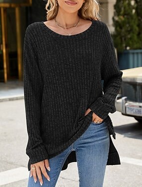 Damen Baumwoll Mischung Rippstricktops Einfarbig Elegant Stilvoll Lässig Langarm Rundhalsausschnitt Normale Oberteile Täglich Ausgehen Schwarz Weiß Grün Frühling Herbst