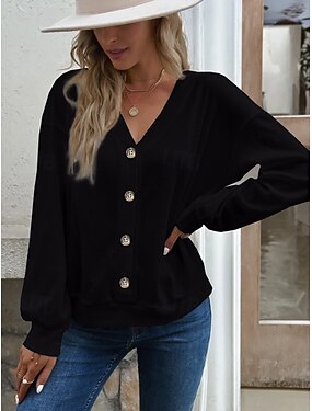 Damen Bluse Knöpfe Einfarbig Stilvoll Lässig Langarm V Ausschnitt Normale Oberteile Täglich Blau Schwarz Weiß Grün Khaki Frühling Herbst