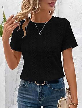 Damen Bluse Oberteil mit Ösen Spitzentops Ausgehöhlt Einfach Täglich Stilvoll Basic Kurzarm Rundhalsausschnitt Normale Oberteile Täglich Arbeit Ferien Schwarz Weiß Orange Sommer Frühling