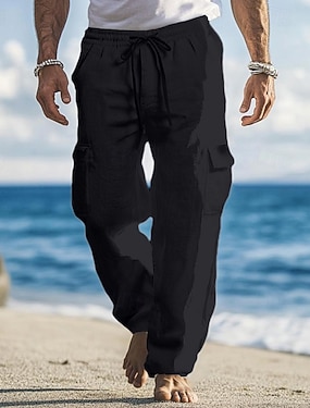 Herren Leinenhose Cargo-Jogger Hose Hosen Sommerhosen Strandhose Kordelzug Elastische Taille Multi Pocket Glatt Komfort Atmungsaktiv Casual Täglich Festtage Modisch Klassicher Stil Schwarz Weiß
