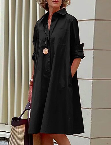Damen-Hemdkleid, Freizeitkleid, Etuikleid, einfarbig, Knopfleiste, Tasche, Hemdkragen, Midikleid, lässig, täglich, langärmelig, Sommer, Frühling