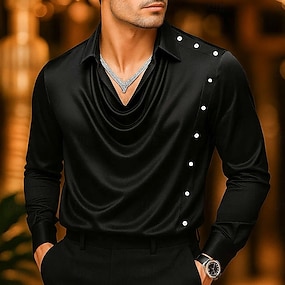 Herren Hemd Seidenartig Satinhemd Freizeithemd Einfach Formell Hochzeit Schwarz Wein Marineblau Gold Langarm Wasserfallausschnitt Frühling & Herbst Ganzjahres Bekleidung Gerafft