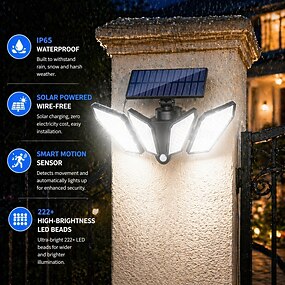 IP65 wasserdichte, solarbetriebene 4-flammige Smart-Wandleuchte mit Bewegungsmelder, 222 LEDs, verstellbar und drehbar, 3 Beleuchtungsmodi – dekorative Garten-, Hof-, Wand-, Veranda- und