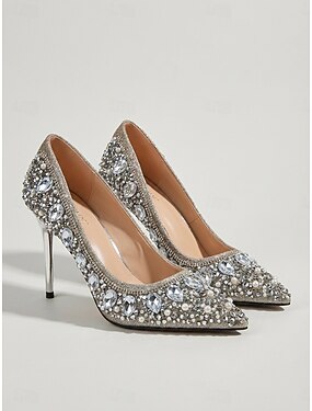 Silberne, mit Kristallen verzierte Brautpumps mit Schleife – elegante Stiletto-Brautschuhe für kirchliche Trauungen und festliche Anlässe