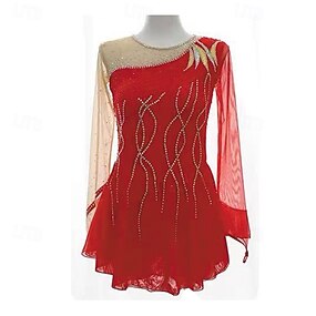 Eiskunstlaufkleid Damen Mädchen Eislaufen Kleid Rot Patchwork Daumenloch Netzstoff Spandex Dehnbar Training Übung Professionell Eiskunstlaufkleidung Thermowarm Kristall / Strass Langarm Eislaufen