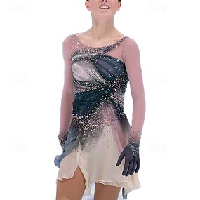 Eiskunstlaufkleid Damen Eislaufen Kleid Schwarz Grau Patchwork Offener Rücken Dehnbar Training Wettbewerb Eiskunstlaufkleidung Klassisch Kristall / Strass Langarm Eislaufen Eiskundstlauf