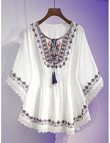 Damen Bluse Spitze Bestickt Einfarbig Bohemien Urlaub Lässig Dreiviertelarm Rundhalsausschnitt Normale Oberteile Täglich Blau Weiß Sommer Frühling Herbst