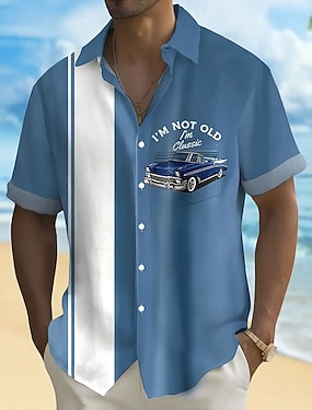 Herren Gestreift Mit Buchstaben bedruckt Bowlinghemd Knopfhemd Kurzarm Modisch lässig Urlaub Sport im Freien Strandbekleidung Sommer Frühling Umlegekragen Hemden mit Kragen Eine Tasche vorne Blau
