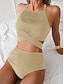Womens Bikini 2-teiliger Badeanzug Sexy Cutout Cheeky Bauchkontrolle Hohe Taille Slim Urlaub Strandbekleidung Einfarbig V-Hals Ärmellose Bademode