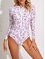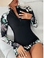 Damen Badeanzug Einteiler Monokini Bademode Bauchkontrolle Hohe Taille Schlank Urlaub Strandbekleidung Blumen Hoher Ausschnitt Langarm Badeanzüge