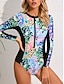 Damen Badeanzug Einteiler Monokini Anti UV Shirt Bademode Reißverschluss Bauchkontrolle Hohe Taille Schlank Frontreißverschluss Urlaub Strandbekleidung Grafik Hoher Ausschnitt Langarm Badeanzüge