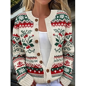 Damen Weihnachtspullover Fair Isle Pullover Strickjacke Mode Täglich Lässig Grafik Gerippt Rundhalsausschnitt Knöpfe Druck Langarm Normale Oberteile Stricken Weihnachten Outdoor Täglich Beige Herbst