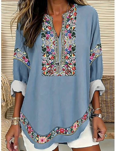 Damen Hemd Boho-Hemd Bluse Druck Blumen Grafik Vintage Täglich Stilvoll Langarm V Ausschnitt Normale Oberteile Täglich Ferien Blau Weiß Gelb Rosa Grün Sommer Frühling