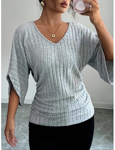 Damen Bluse Einfarbig Stilvoll Lässig Dreiviertelarm V Ausschnitt Normale Oberteile Täglich Grau Frühling Herbst
