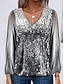 Damen T Shirt Funkelnd Fest / Feiertage Langarm Kalte Schulter V Ausschnitt Normale Oberteile Party Wochenende Pailletten Khaki Grau Frühling & Herbst