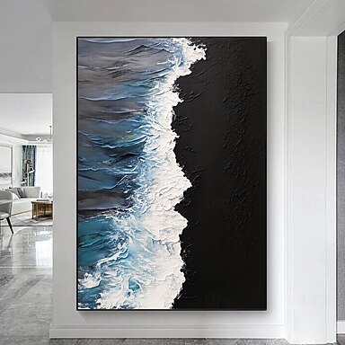 Großes abstraktes Gemälde, handgemalte Wandkunst, blaue Texturmalerei, blaue abstrakte Wandkunst, großes schwarz-blau-weißes abstraktes Gemälde, Boho-Wohnzimmer-Wanddekoration