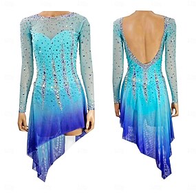 Eiskunstlaufkleid Damen Mädchen Eislaufkleid Blau Hellblau Patchwork Daumenloch Dehnbar Training Praxis Professionelle Eislaufbekleidung Kristall/Strass Langarm Eiskunstlauf