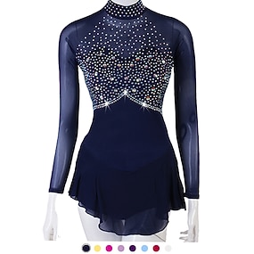 Eiskunstlaufkleid Mädchen Eislaufen Kleid Marineblau Patchwork Offener Rücken Dehnbar Training Wettbewerb Eiskunstlaufkleidung Klassisch Kristall / Strass Langarm Eislaufen Eiskundstlauf