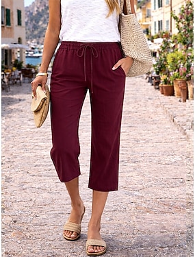 Damen-Caprihose aus 100 % Baumwolle, Sommerhose, Freizeithose, knöchellang, naturfarben, einfarbig, Seitentaschen, atmungsaktiv, bequem, ohne Gummizug, für Wochenende, schwarz, weinrot, grün, khaki, Frühling & Sommer