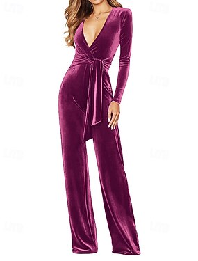 Damen Overall Aktiv Einfarbig Langarm Weites Bein V Ausschnitt Mit Gürtel Urlaub Party Normale Passform Blau Schwarz Wein Frühling