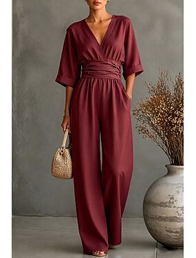Damen Overall Aktiv Einfarbig Langarm Weites Bein V Ausschnitt Mit Gürtel Urlaub Party Normale Passform Blau Schwarz Wein Frühling