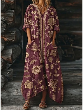 Damen Langes Kleid Maxikleid Boho-Kleid Vintage-Kleid Freizeitkleid Vintage Täglich Outdoor Urlaub Normale Passform Blumen Langarm V Ausschnitt Wein Frühling Herbst