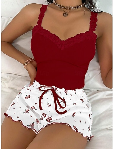 Damen Schlafanzug Set Lässig Komfort Blumen Spitze Elastischer Bund Trägertop Shorts Täglich Heim Ärmellos Träger Blau Rosa Wein Khaki Sommer Frühling Normale Passform