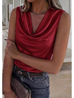 Damen Satin-Top T Shirt Einfarbig Elegant Stilvoll Lässig Ärmellos Wasserfallausschnitt Normale Oberteile Täglich Ausgehen Champagner Gold Schwarz Wein Braun Sommer Frühling