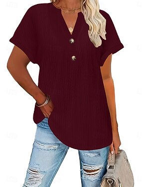 Damen Waffel T-Shirt T-Shirt Knopf vorne Seitensplit Einfarbig Elegant Mode Lässig Kurzarm Fledermaus Ärmel V Ausschnitt Normale Oberteile Täglich Ausgehen Urlaubskleidung Weiß Wein Sommer Frühling