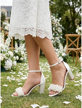 Damen-Sandalen mit Blockabsatz und weißen Spitzendetails sowie Perlen- und Blumendetails – perfekt für Hochzeiten oder Brautveranstaltungen